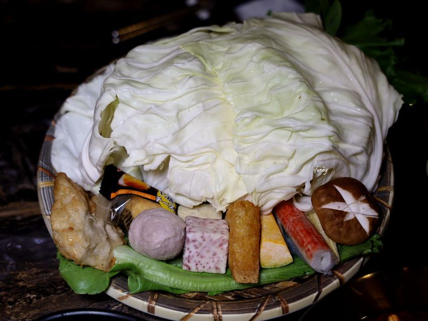 菜盤滿滿一大盤中,有高麗菜、青江菜、芋頭、凍豆腐、油豆腐、起司丸、貢丸、甜不辣、南瓜、香菇、蟹肉棒、玉米筍等。