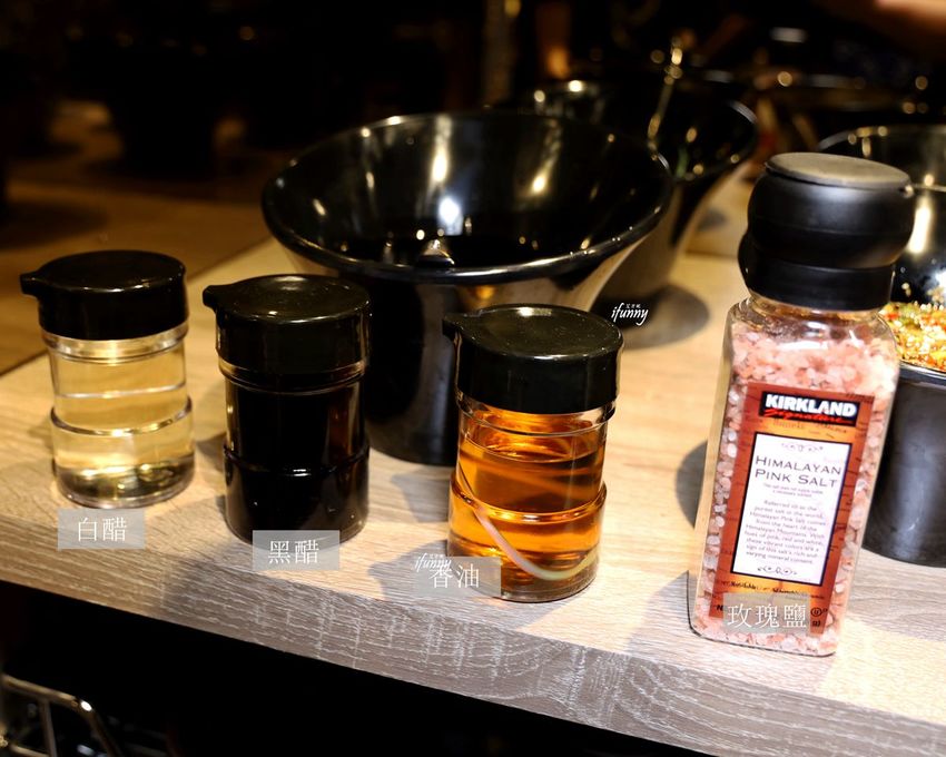另外一旁還有常用的白醋、黑醋、香油及玫瑰鹽。