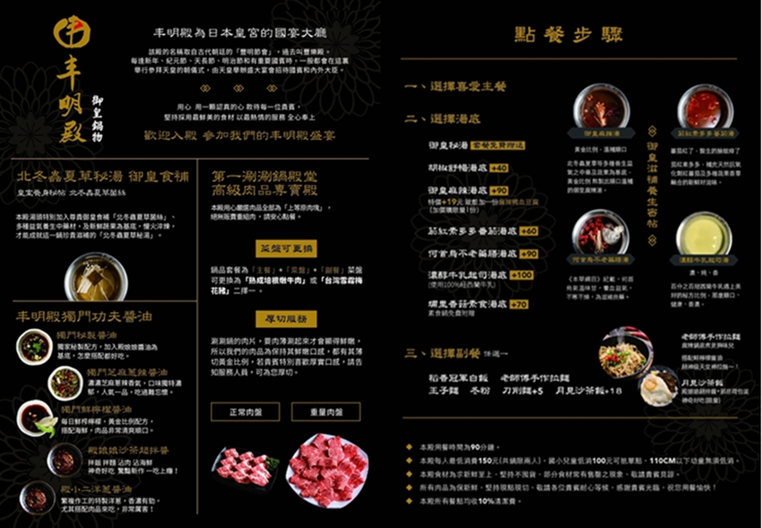 吃火鍋最重要的湯底,丰明殿是採用皇室養身秘方的北冬蟲夏草及多種益氣養生的中藥材,並以日本昆布與蔬果為基底,細火燉出自然的甘甜滋味。肉品則以上等原肉塊,絕不使用組合肉。套餐均有主餐及副餐及菜盤。肉控還能將其中的菜盤更換成<熟成培根嫩牛肉>或<台灣雪霜梅花豬>。台灣雪霜梅花豬>熟成培根嫩牛肉>