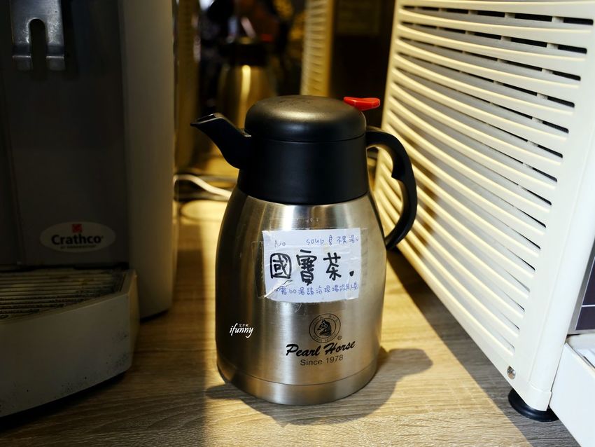 為了習慣喝熱飲的客人備了溫熱的國寶茶,還有開飲機,非常地貼心。這保溫瓶裝的是是國寶茶,若需要加湯底,跟服務人員說就可以囉!