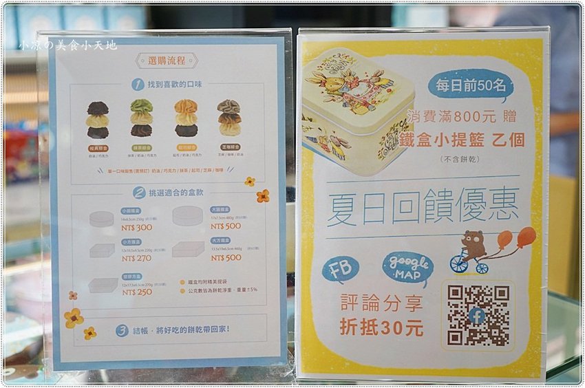 選購方式如DM上,先選曲奇口味(這邊以經典綜合、抹茶綜合、起司綜合、芝咖綜合)為主,如需單一口味訂購,需先電話預訂再來拿取唷!!! 選好口味後→再挑選自己喜歡的鐵盒,有大、小圓鐵盒,大、小方鐵盒、塑膠方盒,每一鐵盒均會附上精美提袋。目前優惠每日前30名消費滿800元贈送小提盒(不含餅乾)or塑膠方盒二選一,googlemap或FB評論分享,再折抵 30 元