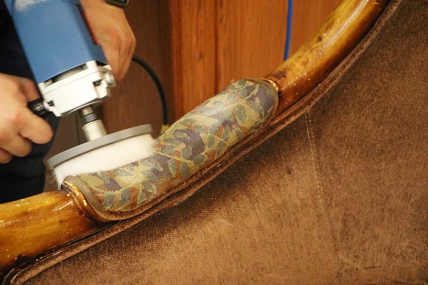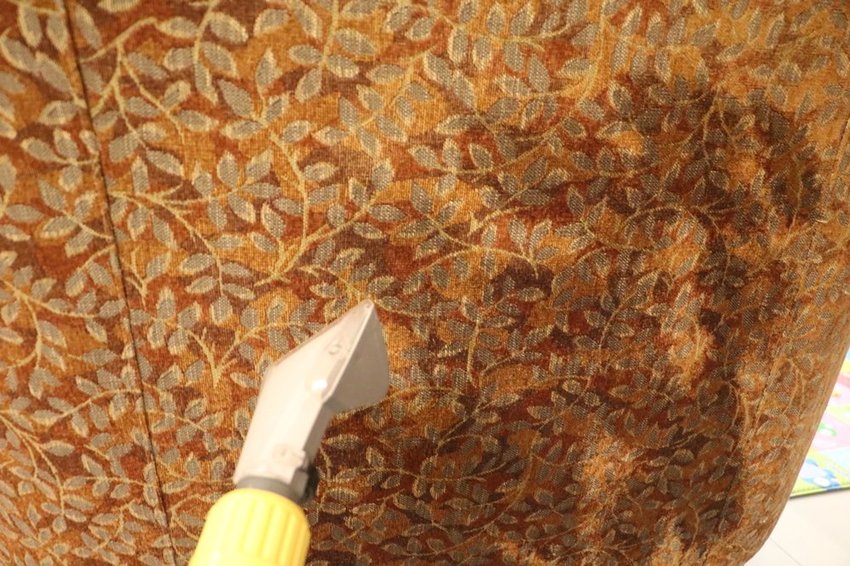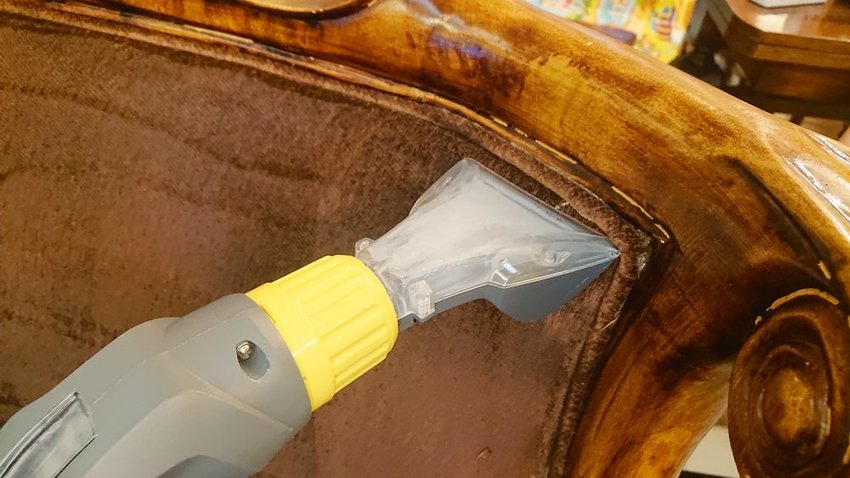 電動刷頭刷洗布沙發表面與淺層髒污,不僅表面刷洗,椅背、扶手都很盡心刷洗清潔。