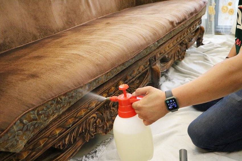 使用中性酵素清潔劑均勻噴灑在沙發每一個角落。