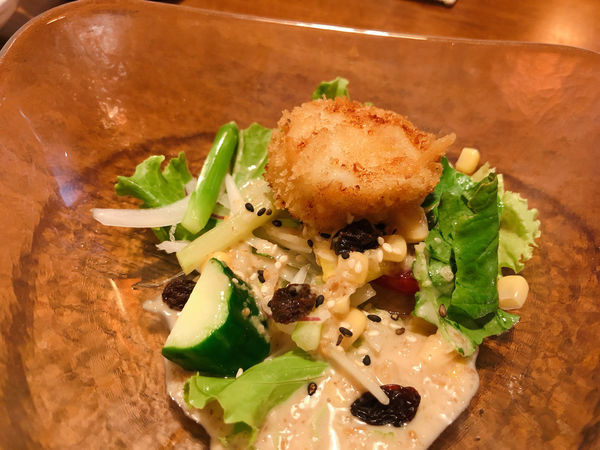 干貝沙拉的干貝是炸的,頗大顆,炸起來也不會太油膩,搭配下面沙拉很剛好