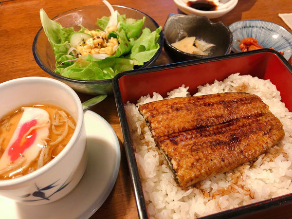 鰻魚飯定食(380元),裡面附沙拉、茶碗蒸、小菜、味增湯,整體上桌澎湃指數高,沙拉跟小菜都算新鮮好吃,茶碗蒸很特別的是裡面放吻仔魚,茶碗蒸口味偏重,不過茶碗蒸依舊滑順,忍不住一口接一口