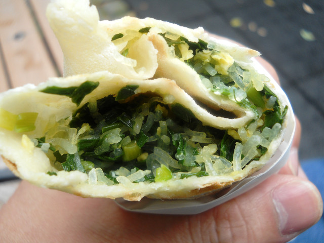 這一口咬下,果然是韭菜香四溢,冬粉又徹底的拌演了乳化的效果,讓這每一口的咀嚼都充滿著韭菜特有的香味,好不過癮。再則,由於外表是屬於乾烙式,沒了油煎餅皮香的干擾更能盡情享受這韭菜的單純,如果你深愛韭菜盒真得嚐上它一嚐,必定可以了解小虎的感受。