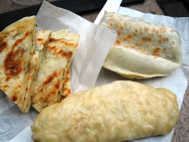 吃完豆腐卷再加上韭菜盒子後,看著這切開成六片的乾烙蔥油餅,我心想八成是吃不完的,就算不飽不膩也不免口乾舌燥。但意外的是,小虎拍完照後,一邊散步去「誠品」一邊咬著這另類蔥油餅,沒到誠品竟六片全數吃淨,而且不感一絲口渴,驚喜也!