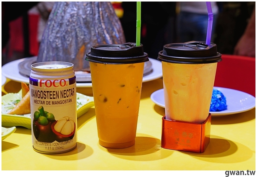 從泰國進口的山竹果汁,喝起來甜甜的,每日限量,不過跟真的山竹味道還是有差別!泰式奶茶以傳統古法熬煮,但甜度有調整過,不像泰國喝到的那麼甜。而泰辛滅火器更可愛,還用了滅火器的底座裝盛,這杯飲料其實是椰奶冰沙加入紅色的蛇皮果汁,是泰國很常見的飲料,也能解辣呦