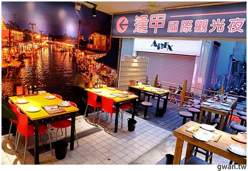 後面還有一個開放式的戶外區,背景變成了夜晚的水上市場!因為泰辛火山排骨也是一間寵物友善餐廳,甚至準備了毛小孩特餐,我猜戶外區應該是規劃給帶毛孩客人的用餐區