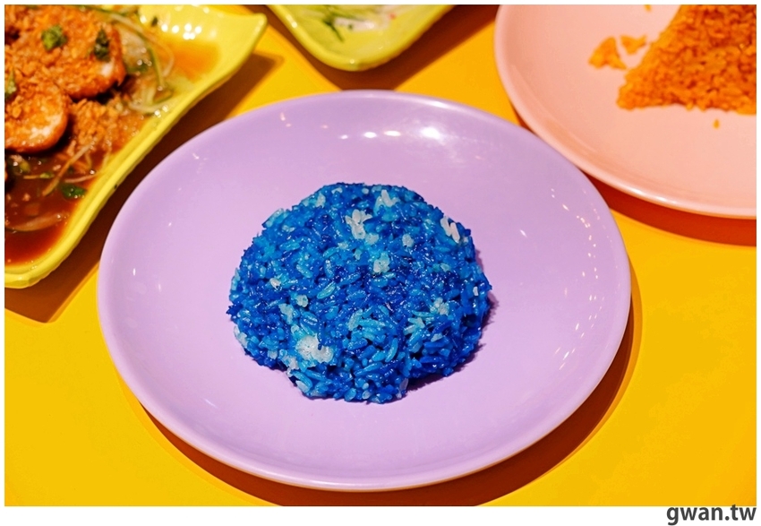 藍椰香飯好漂亮,米飯裡有深深淺淺的漸層藍,是用椰漿和蝶豆花去煮的,帶點淡淡椰子香甜還吃得到椰絲口感