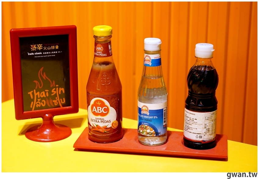 桌上都有泰國進口的調味料,泰式辣醬、醋、魚露,可以照個人口味再調整
