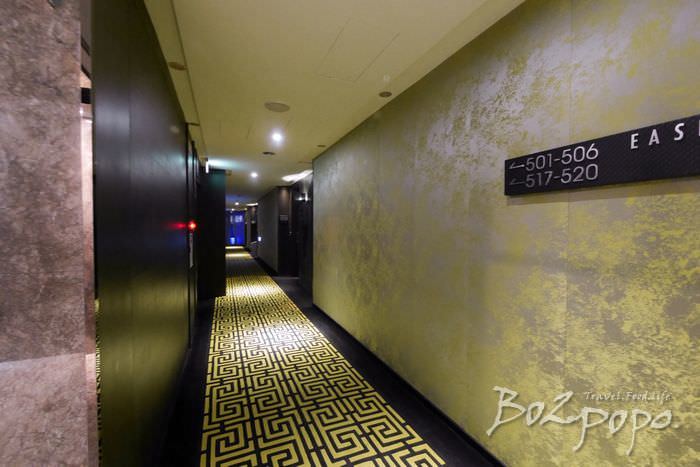 走廊有舖地毯,軟軟的,以黑金色調為主,營造出低調的奢華風。