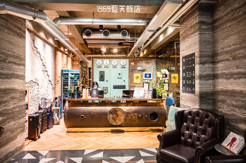 推開大門走進1969藍天的大廳,你可以看到飯店內充滿歷史感與工業風設計,就讓我們先來跟大家詳細介紹一下這個接待大廳,1969藍天最熱門的IG打卡景點之一也在這裡,