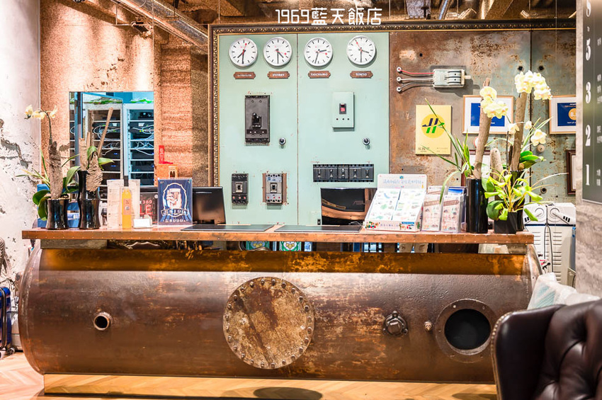 接待櫃台使用的是用來燒熱水的廢氣鍋爐,倒立放置後鋪上桌面,就形成這個充滿復古風格的櫃台,還有後面的舊式機電牆,這些東西都是從老建築中所保留下來的元素,