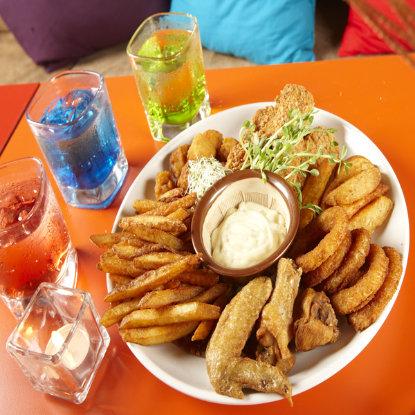 「炸拼盤」320元/精選薯條、薯瓣、香酥雞翅、洋蔥圈、雞米花、與檸檬雞柳條,適合3~4人暢飲時一起共食,份量十足,氣氛滿分!