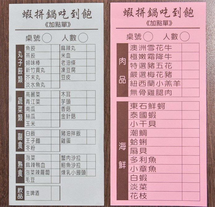 這二張則是吃到飽的加點單,喜歡吃到飽的來蝦拚鍋也不會失望,因為食材相當豐富