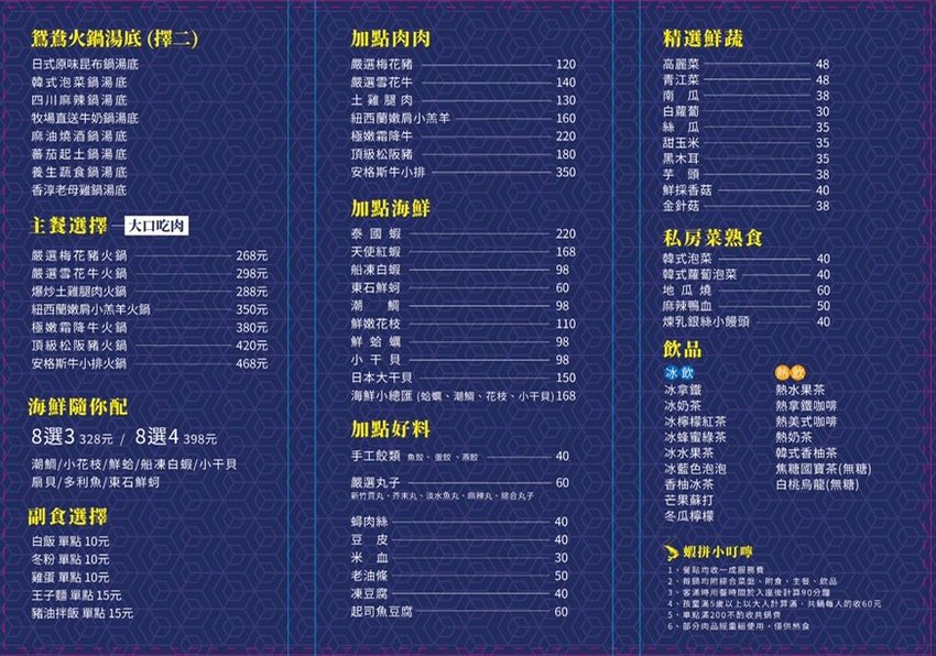 菜單上的選擇非常多,點餐流程是1️⃣選湯底,2️⃣選主餐(肉類)或(海鮮),3️⃣選副食