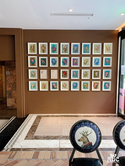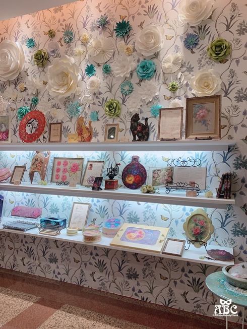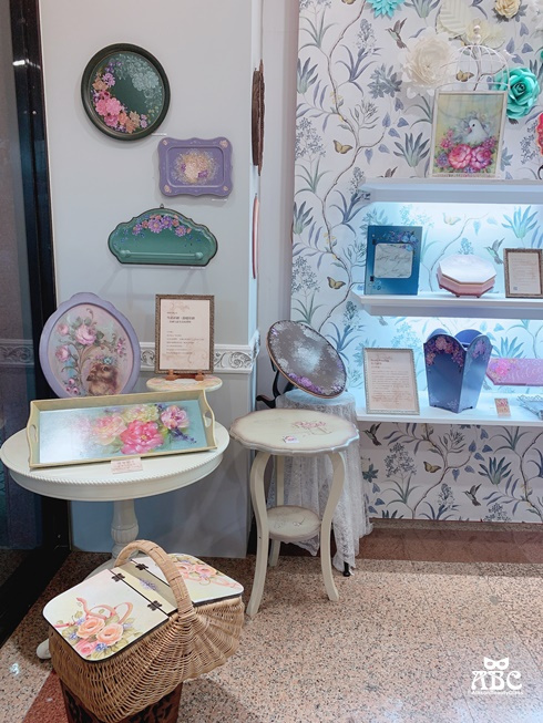 牆上的花卉紋壁紙與立體玫瑰裝飾,呼應著展示的彩繪玫瑰作品,