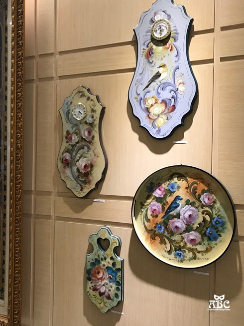 另一面牆上展示著金碧輝煌的裝飾畫,以及彩繪木器、傢俱