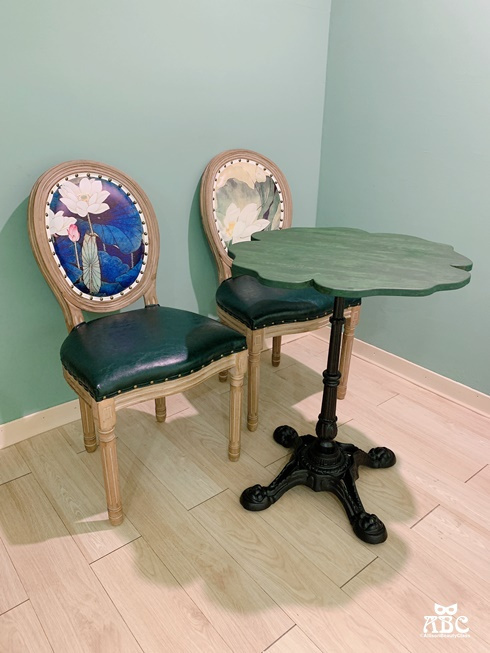 桌面是飯店自己設計手工彩繪!深綠色的桌椅,搭配蒂芬妮綠的牆面,
