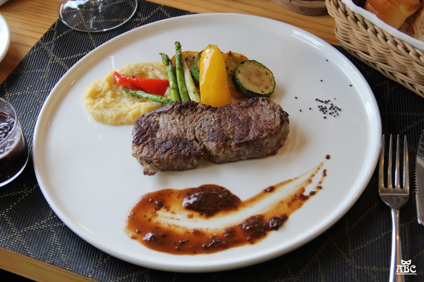 再來是攝影師點的「嫩煎7oz紐約客牛排佐松菇紅酒汁」
