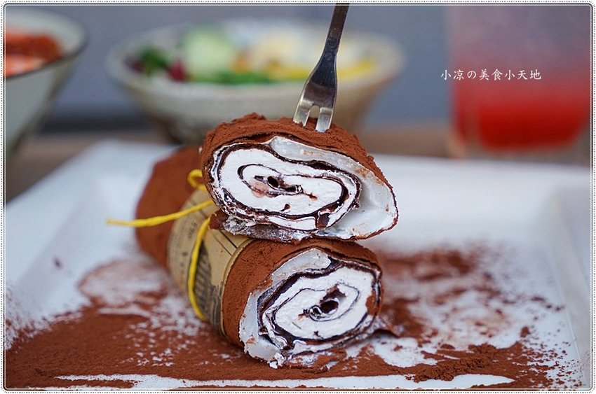 毛巾蛋糕真的很特別,以千層的做法將蛋皮捲入鮮奶油、手作莓果醬、薄薄Q嫩的雪莓娘外皮,再撒上大量的可可粉。入嘴香濃的巧克力牽動了鮮奶油的滑潤,那QQ的雪莓娘讓口感更為層次分明,一口一口吃、時不時的還能吃到莓果的酸甜呢~