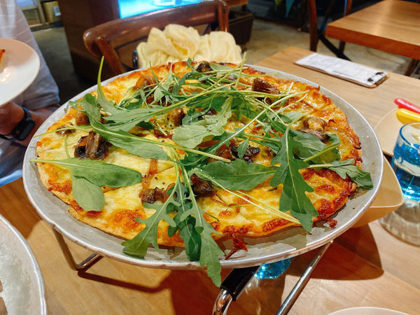 這款「青醬蘑菇芝麻菜薄餅」也是人氣口味之一,打卡指數破表,可惜芝麻菜不受我家小朋友喜愛,但我覺得搭配薄餅一起吃,嘴裡散發芝麻菜的香氣,剛好可以調和酪梨與蘑菇的青澀味覺。