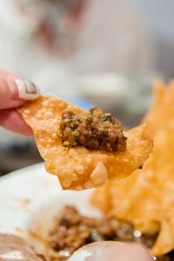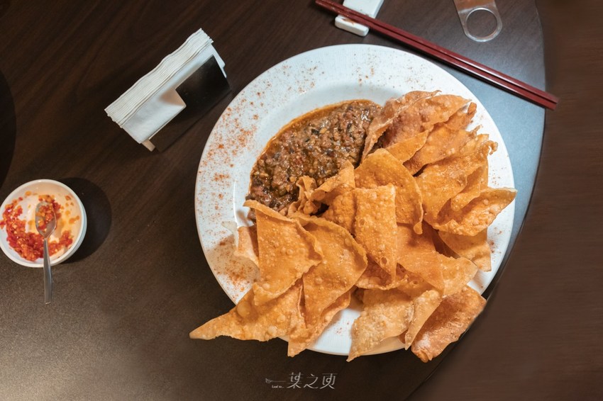 桿過之後酥炸得相當薄脆的餅皮,吃起來有點像炸餛飩的外皮;旁邊搭配的沾醬則是辣肉醬皮蛋,拿起脆皮餅,舀起一匙皮蛋肉醬後,小心翼翼地放到餅上,再趕緊入口。整個過程得一氣呵成,那餅薄得幾乎承載不了皮蛋肉醬的重量,稍不留神就斷了。