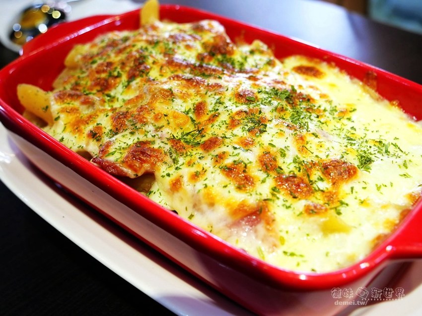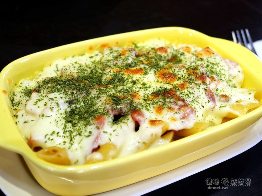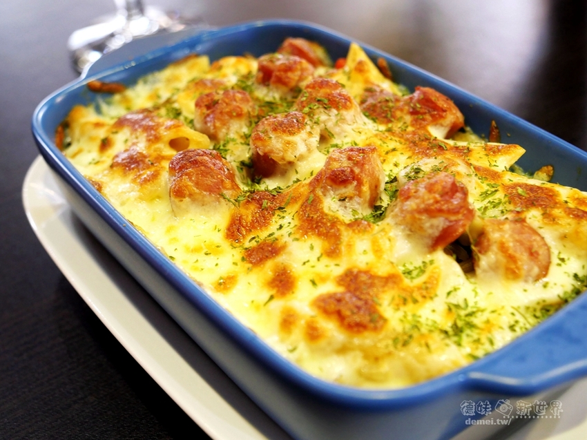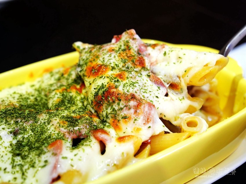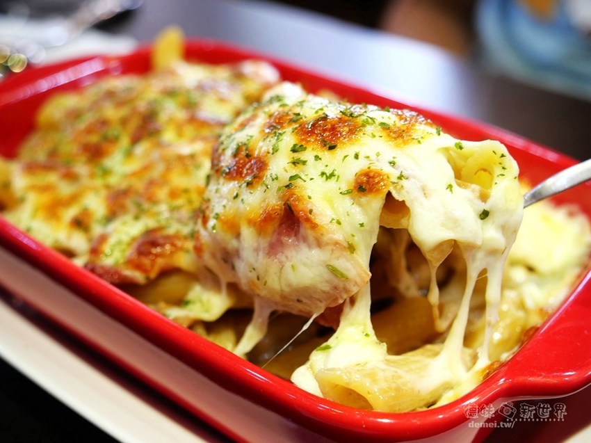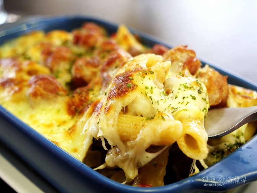 金黃微焦厚起司層下有著鹹香培根、蘑菇切片、軟Q筆管麵,上桌時炙手且香氣四溢。