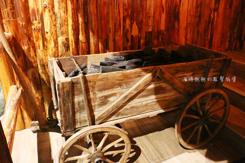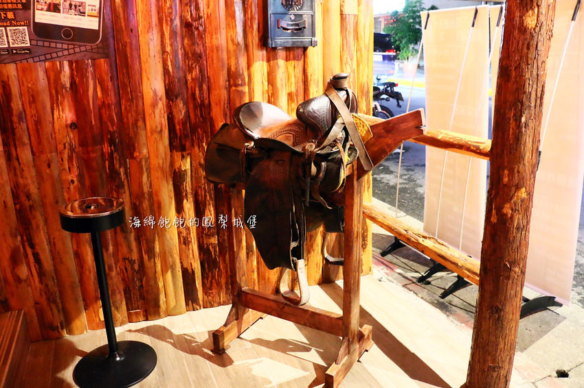 以原木裝潢、牛仔馬鞍、煤礦車、煤油吊燈、鹿角...裝飾