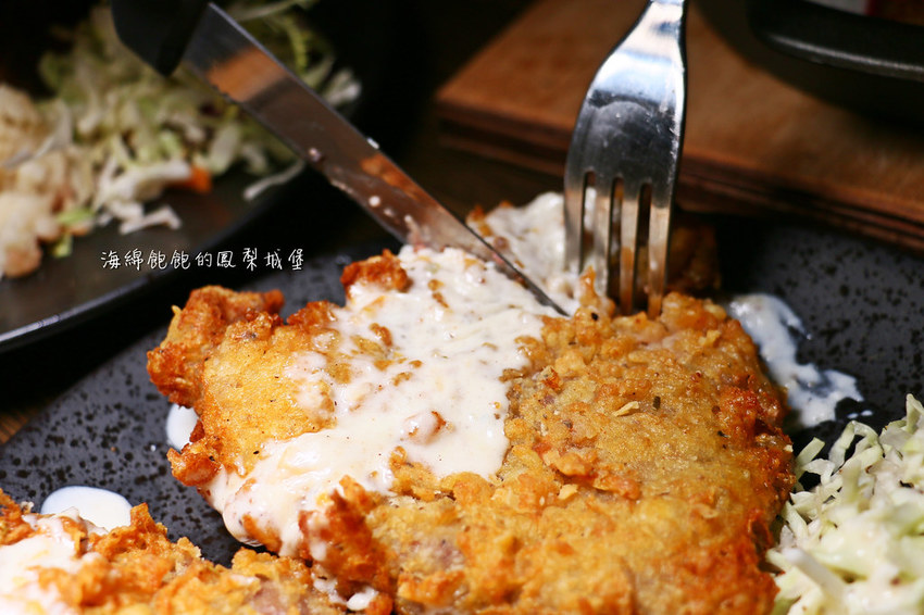 酥脆麵衣包住牛排,切下去豐盈的肉汁流出