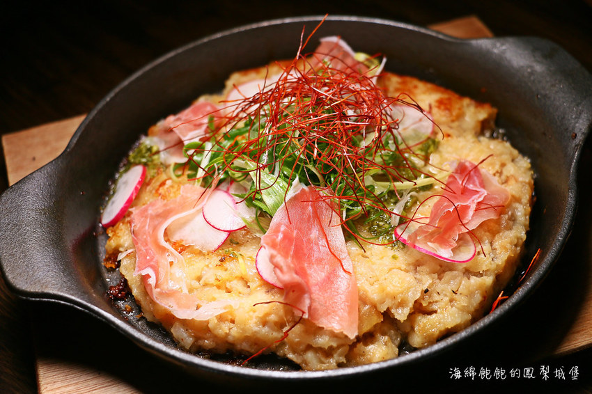 上面搭配帕瑪森火腿、蔥絲、辣椒絲裝飾