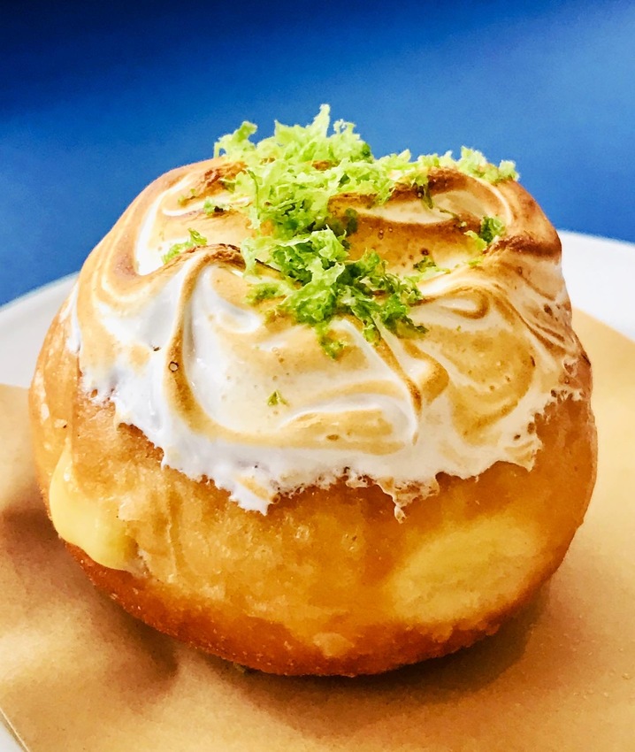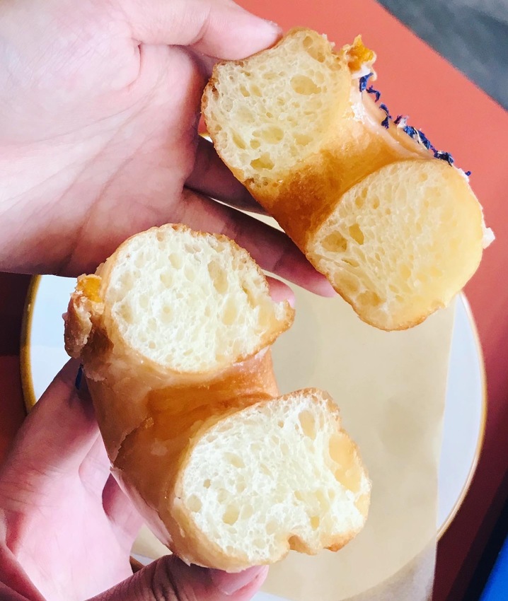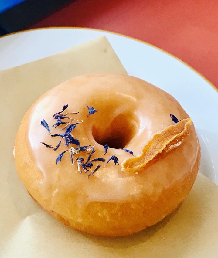 甜甜圈部分,造型上蜜桃第一眼看似很簡單,裹了糖在上方為主,但搭配上藍芙蓉花和台灣特選水蜜桃果乾的點綴,看起來就多了些詩意感。而檸檬檸檬比較像是把檸檬塔變成甜甜圈,很直覺可以感受到吃起來大概是怎麼樣的味道。