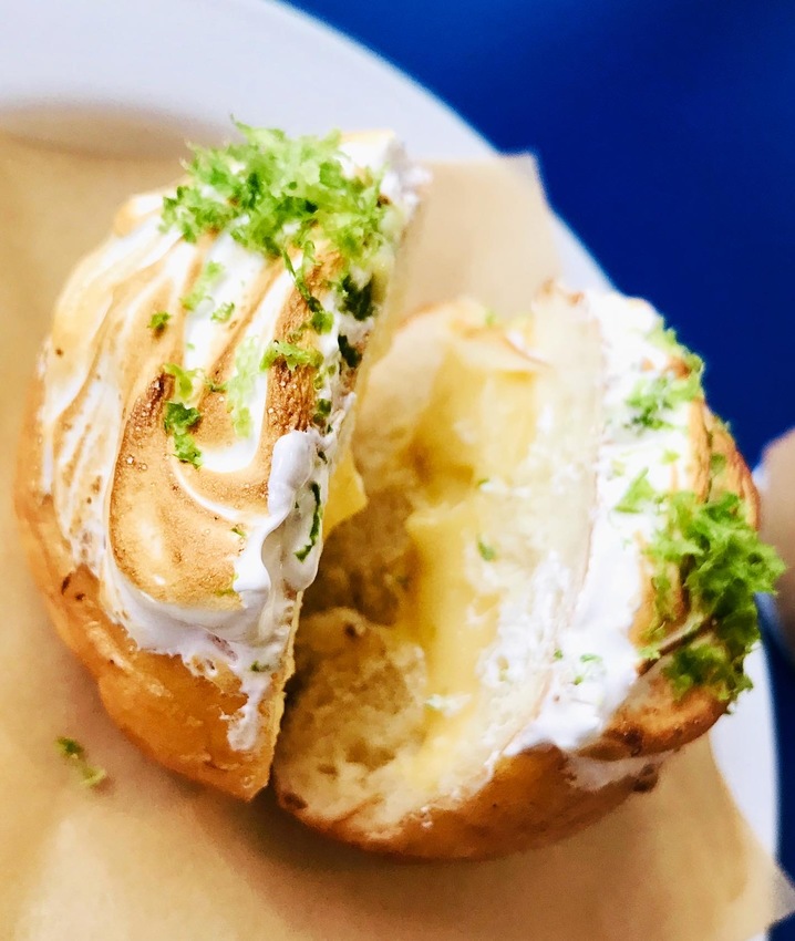 口味和口感上,蜜桃的裡面沒有包餡,檸檬檸檬則是包了檸檬凝乳(就像檸檬塔中間的餡),我們先吃蜜桃,覺得口感很有嚼勁扎實,蜜桃的果香濃厚,雖然沒包餡,但整個吃起來不單調,清爽的甜味,是可以吃第二個的那種!檸檬檸檬外層是義式蛋白霜不會太甜,中間的餡份量很多,口味酸甜,整體覺得甜甜圈和餡料的比例在調整一下會更好,因為感覺吃起來有點真的在吃料,比較注意不到麵包的部分。所以兩款,我們都更喜歡蜜桃這個口味。