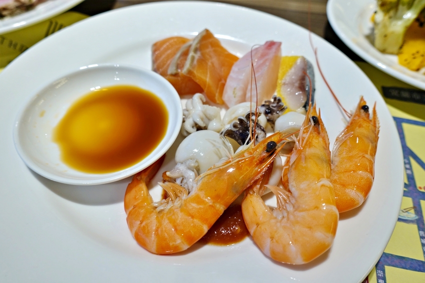 中間區域部份有日式料理、沙拉輕食,還有不少開胃菜。日式料理區是最熱門的,各種生魚片、季節水產類,像是蝦子、花枝等,另外還有壽司類、手捲通通在這,種類多元而且生魚片真的很青!