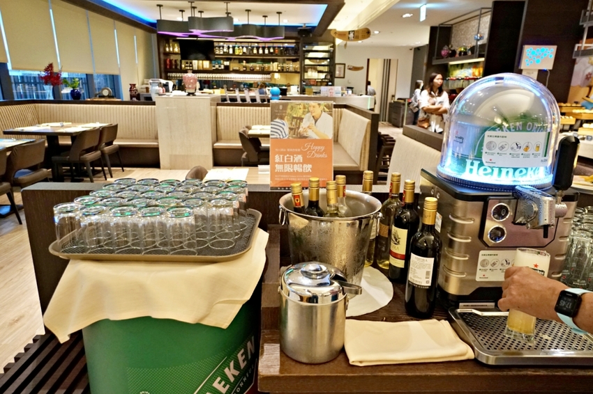 剛剛介紹到的暢飲紅、白酒以及海尼根生啤酒也在這,第一次自己裝生啤其實有點難度耶,除了杯子要傾斜45度角外,ㄧ開始就要把把手直接往下拉,不然拉太慢泡泡會太多,試了兩次才稍微成功一點點😄