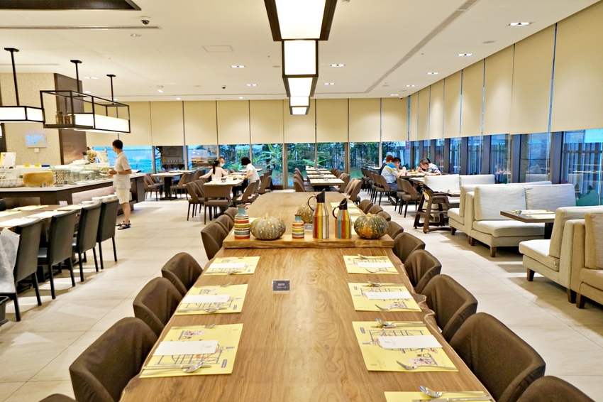 羅琳西餐廳提供早、午、晚餐自助餐,所以第二天的早餐也是在這享用,白天晚上的氣氛感覺不太一樣。入口處有整幅的悅川酒店吉祥物乖乖、呆呆的彩繪牆,富有童趣,很可愛!