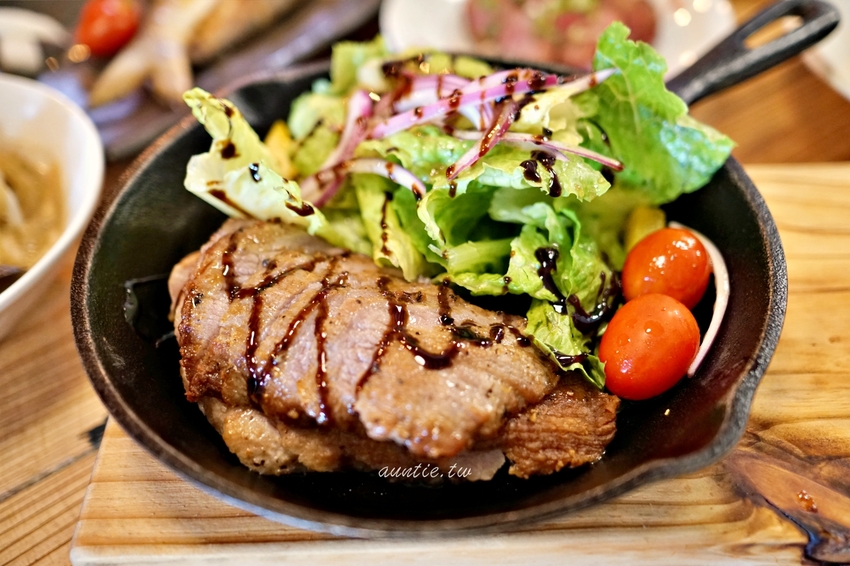 吃起來的部位應該是松阪豬,不過工作人員說是五花,可是感覺又沒那麼肥,這道先煎再烤,口感Q彈Q彈的,一旁還有搭配生菜沙拉跟一些酒醋,豬肉片有醃過,所以本身味道就很夠,搭配酒醋酸甜的味道,真的蠻涮嘴的。