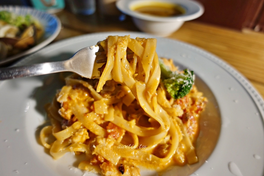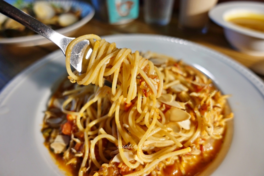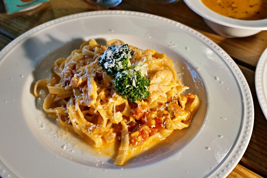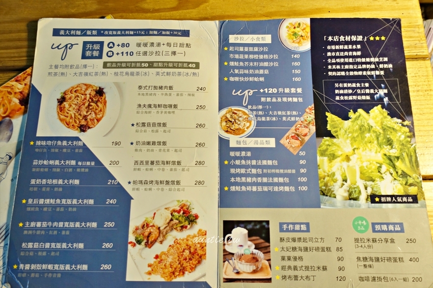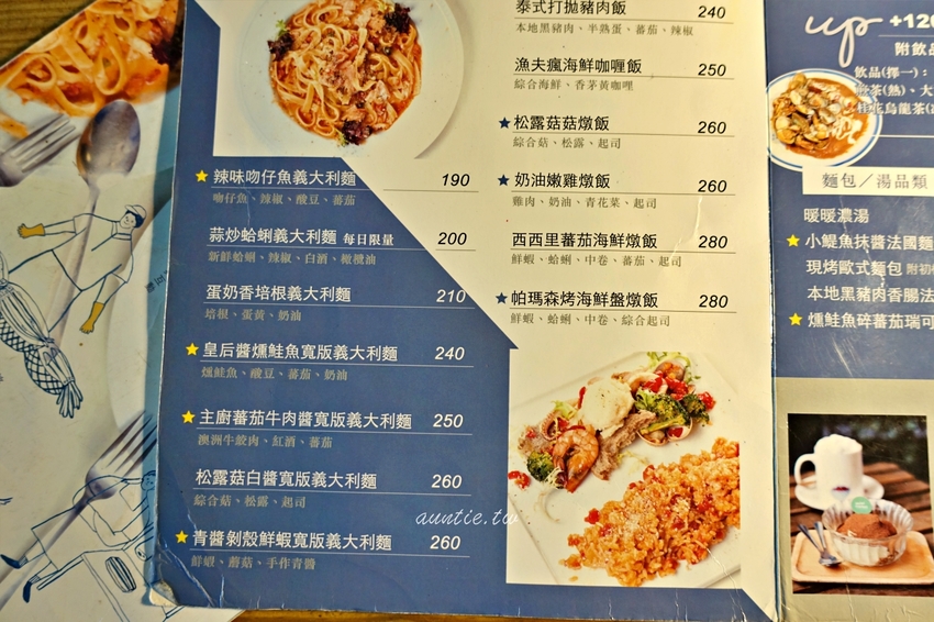 餐點種類不少,除了義大利麵外,還有還有輕食法國麵包、湯品類,還有甜點,點主餐的話都有附上飲料,這次就有加價升級變套餐,多甜點跟濃湯。