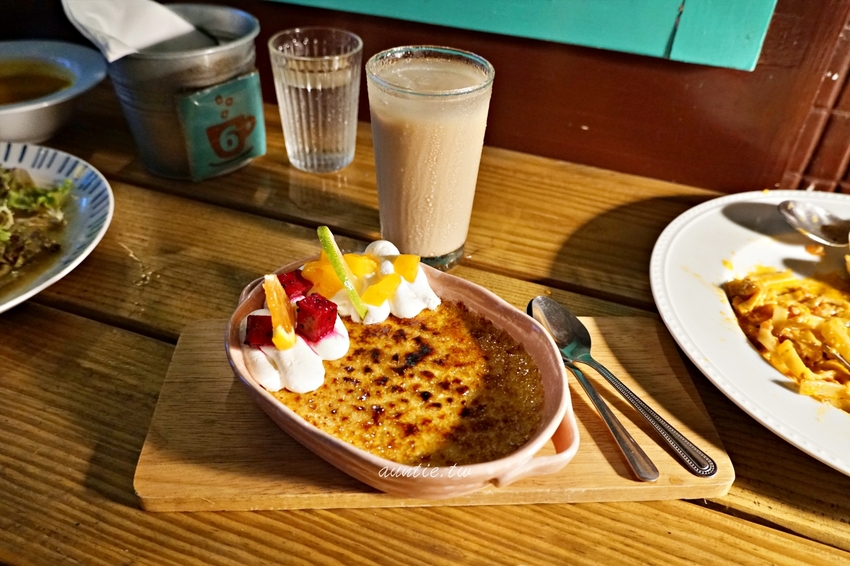 看到布丁就想點!小市場咖啡的烤布蕾大布丁上頭有厚厚的現烤脆焦糖,所以吃起來有點偏甜,不過單吃底下的烤布蕾倒是不會,香草與蛋香很濃郁,也還不錯。