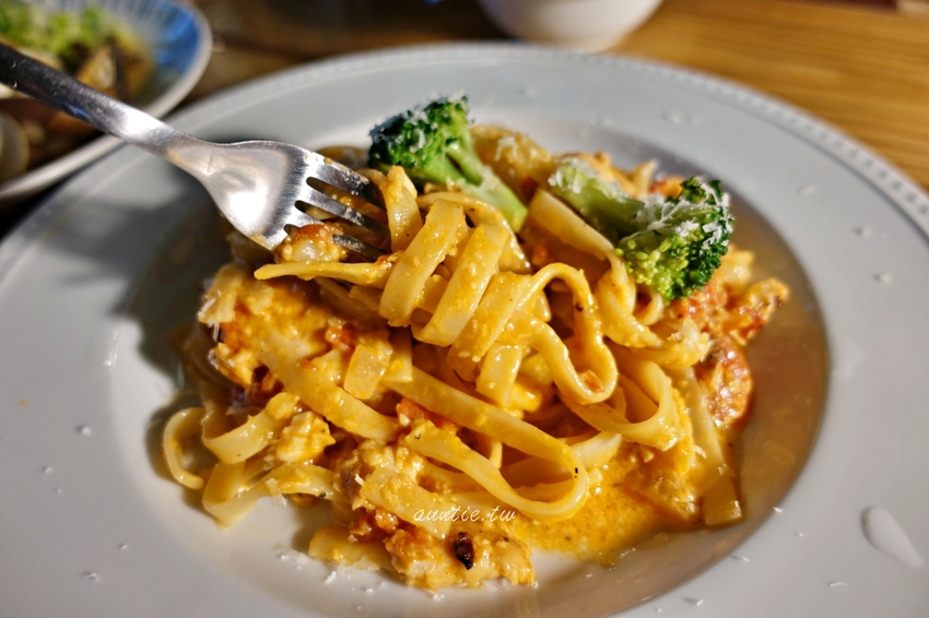紅醬口味義大利麵,燻鮭魚的味道挺濃厚的,寬版義大利麵很Q,口味是不錯,不過吃多有點鹹。