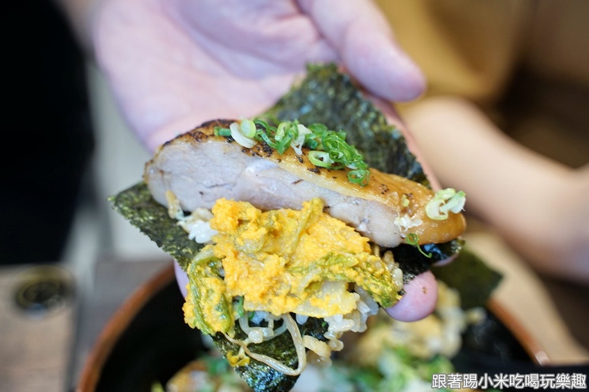 巨無霸雞腿丼飯長的大也是有厚度的,很適合小孩跟長輩享用。雞腿也是有炙燒過,雞皮的油香都跑出來,加上肉質嫩有甜味,也是很下飯的菜色