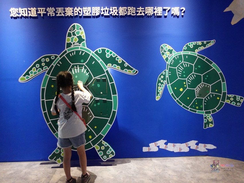 接著來看到這個巨大的裝置藝術,這是用一些廢棄的塑膠瓶打造成的仿鯨魚骨架,既然看到這種環保素材,我們就要進入海洋教育的區域了。