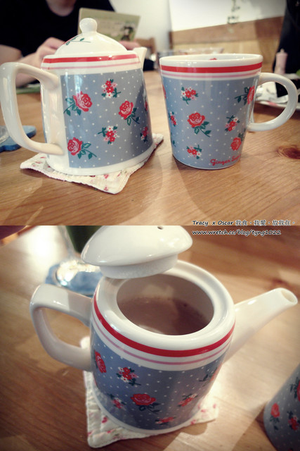 ↑熱玫瑰奶茶,茶具組跟杯墊布都是玫瑰的耶,但是喝起來沒有很玫瑰耶,而且有點淡,份量也比較少。