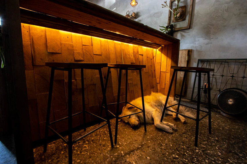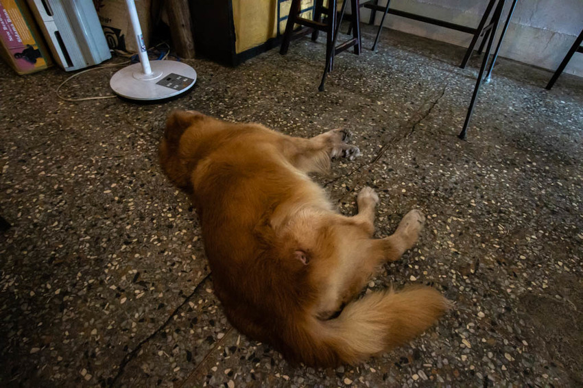 夏日前往時,店裡的冷氣正放送著,二隻店狗也自在的躺在地上。