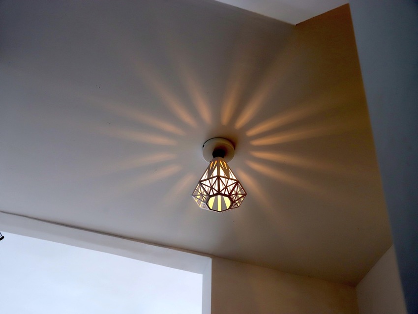 從樓梯上二樓,看到頭上的鑽石造型燈飾,放射狀的光線~好美~