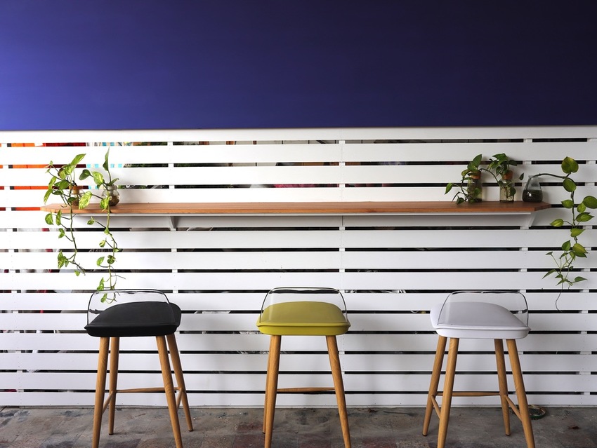 小小一區,只有兩張四人桌椅,美美的一片綠色網美牆為背景