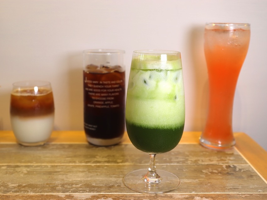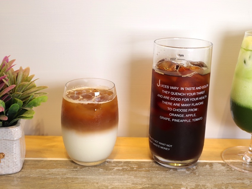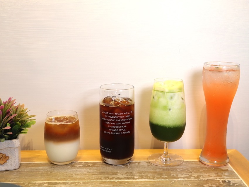 (左到右) 拿鐵咖啡 $90 / 復刻紅茶 $50 / 宇治抹茶歐蕾 $130 /玫瑰紅蘋果氣泡飲 $100(開幕活動打卡贈送)