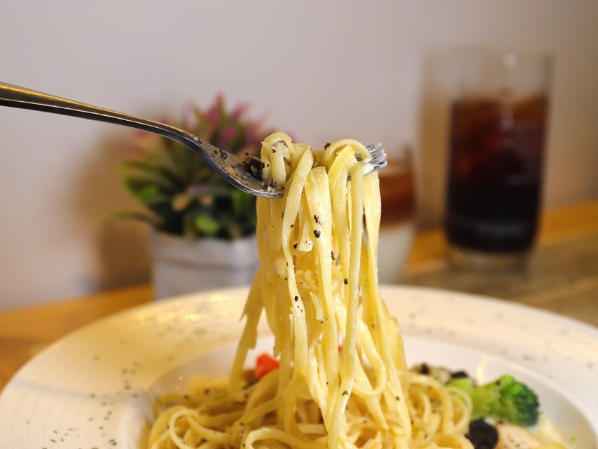 徹底將 上方的黑色松露醬 跟義大利麵拌勻之後,趕快嚐嚐看~