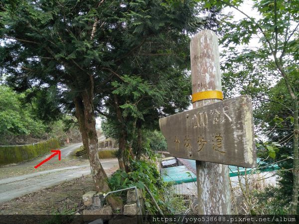 驅車往上行,空氣有明顯的轉變,更涼爽也有了霧氣。放慢速度會看到指標,紅色箭頭處可由此爬竹林步道,或者在往上開段路,由上往下走步道。